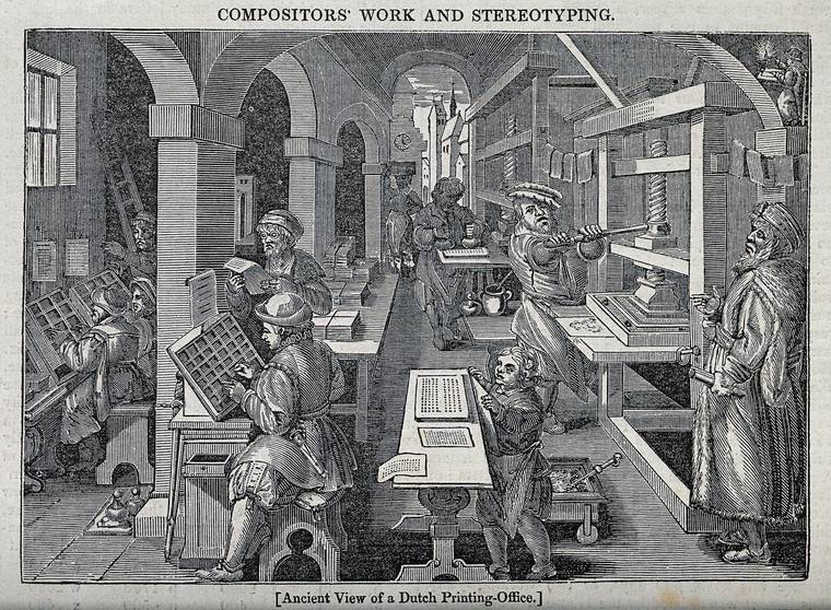 Image: Men working at a printing press, proofing copy, inking, and setting type. Wood engraving. 18–, after Stradanus, ca.1580. Credit: Wellcome Collection. Attribution 4.0 International (CC BY 4.0)